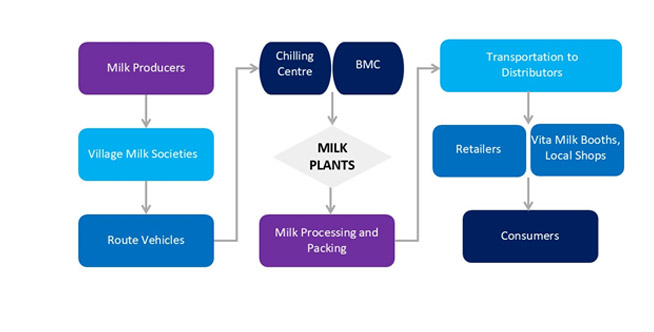 Milk is procured through Village-Level Cooperative Societies (MPCS), ensuring fair and transparent sourcing directly from dairy farmers. The collected milk is chilled at 209 Bulk Milk Coolers (BMCs) located at the village level and at 16 Milk Chilling Centres to maintain quality and freshness. It is then transported for processing to the six milk plants operated by the Haryana Dairy Development Cooperative Federation (HDDCF). Over one lakh milk farmers are associated with Vita through 3,514 Milk Cooperative Societies across the state, making it a robust and farmer-centric dairy network.